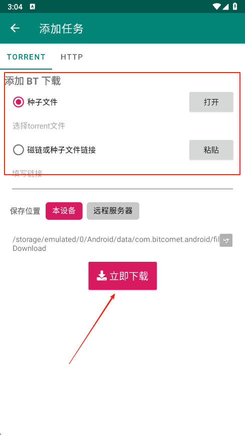 2、进入添加任务页面后,可选择种子文件或磁链或种子文件链接来添加BT下载任务,选好后点击立即下载,即可开始下载。