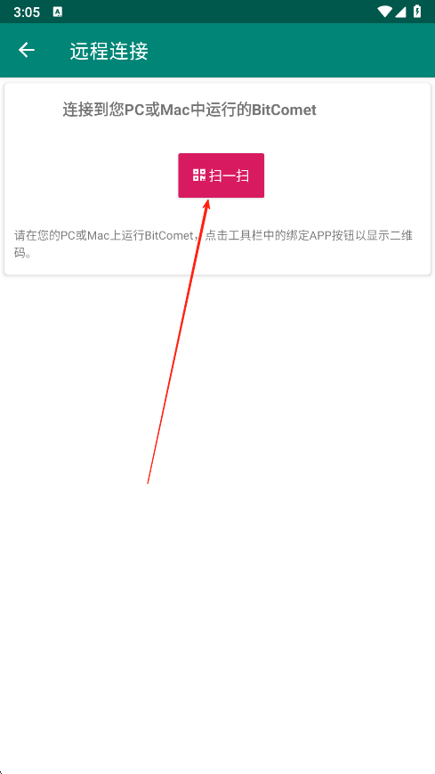 3、若要进行远程连接,点击左侧远程连接选项,进入远程连接页面,点击扫一扫按钮,然后在PC或Mac上运行BitComet,点击工具栏中绑定APP按钮显示二维码。