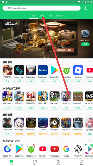 1、在应用商店界面点击顶部排行标签,切换至应用排行页面,查看各类应用的排名情况。