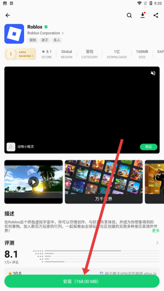 3、在Roblox应用详情页,点击底部绿色安装(168.00MB)按钮,启动该应用的下载安装流程。