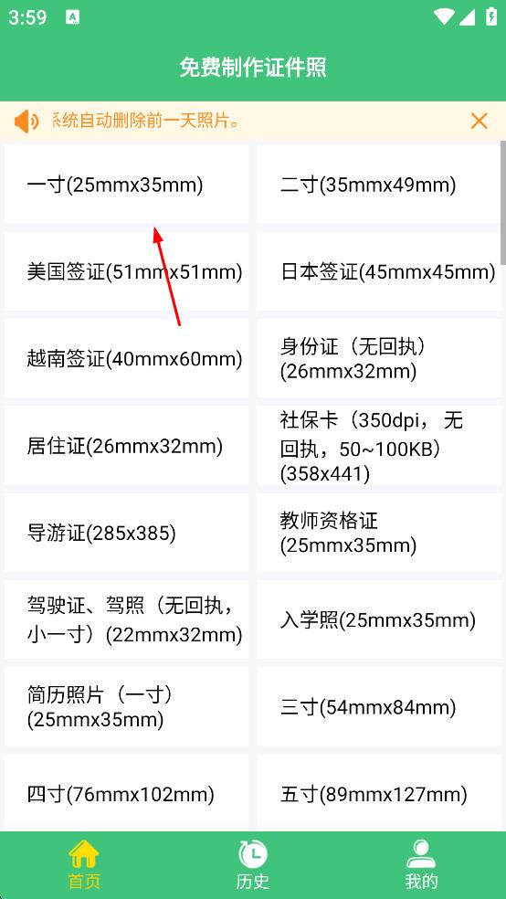 2、在软件主界面,选择所需的证件照尺寸,比如点击一寸,进入照片选择页面。