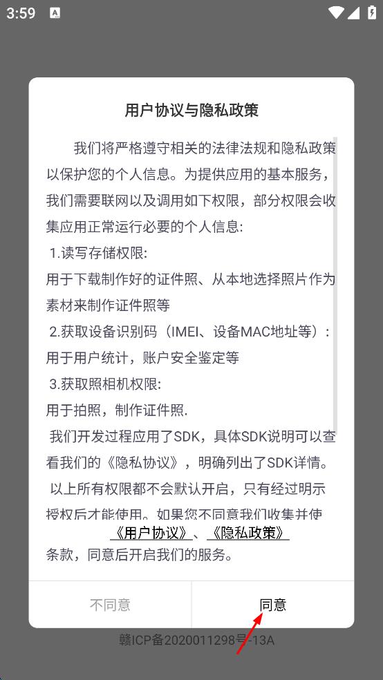 1、打开证件照制作软件,在弹出的用户协议与隐私政策提示框中,仔细阅读相关内容后,点击“同意”,进入软件主界面。