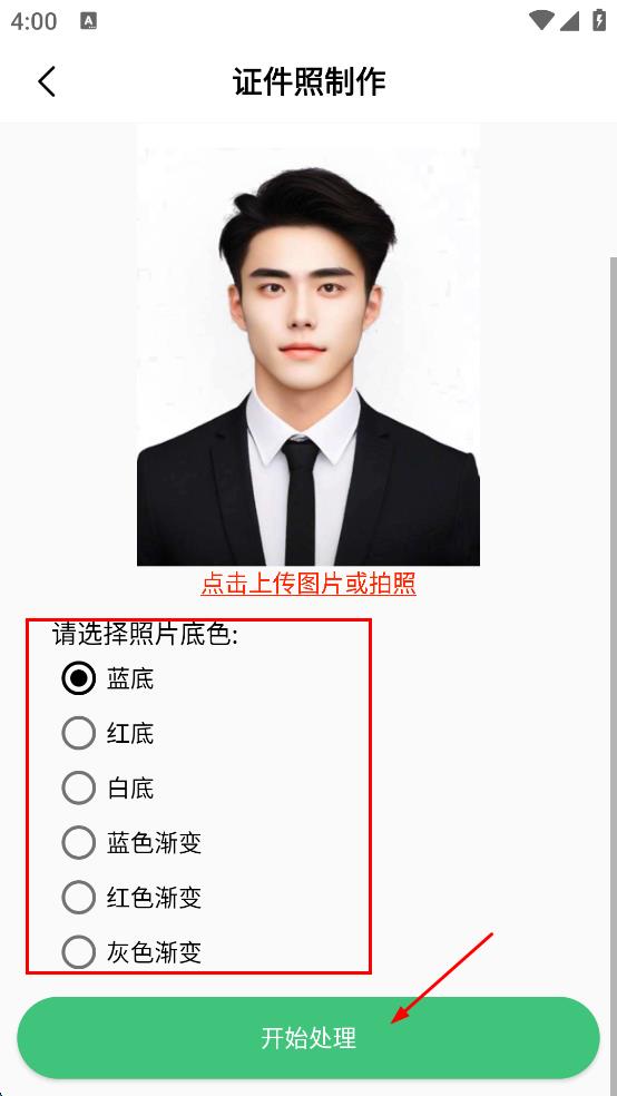 4、在证件照制作页面,选择照片底色,如蓝底、红底等,然后点击“开始处理”,等待软件完成证件照制作。