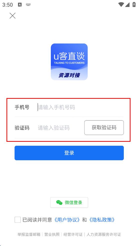 1、打开U客直谈,在弹出的服务协议和隐私政策提示框中,认真阅读相关内容后,点击“同意并接受”,进入U客直谈主界面。