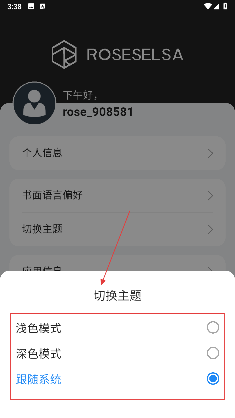 2、在个人中心页面,点击切换主题选项,弹出包含浅色模式,深色模式,跟随系统的主题选择窗口。