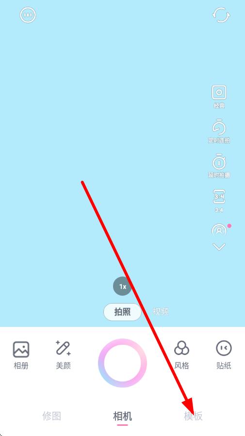 1、打开一甜相机应用,进入拍摄界面后,点击底部的模板选项,进入模板选择页面。