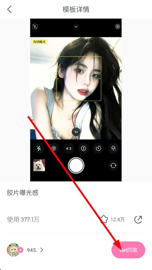3、进入模板详情页,调整拍摄角度让人物或景物入镜,点击get同款按钮进行拍摄,即可拍出带有模板效果的照片或视频。