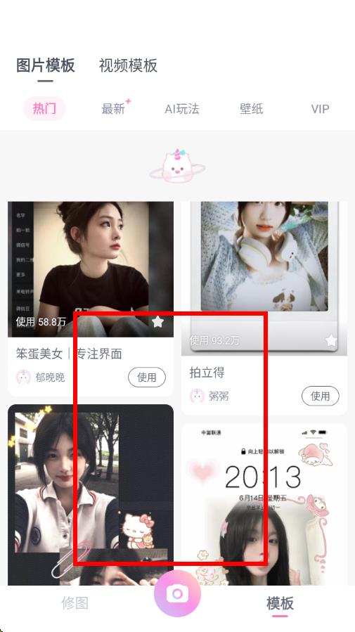 2、在模板选择页面,浏览图片模板和视频模板,如热门、最新、AI玩法等分类,找到心仪的模板,比如拍立得风格模板,点击使用。