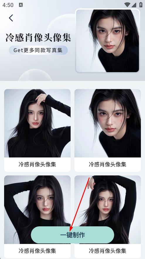 4、在冷感肖像头像集详情页面,点击一键制作,可制作头像。