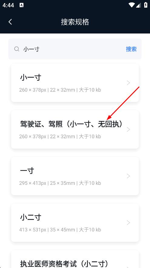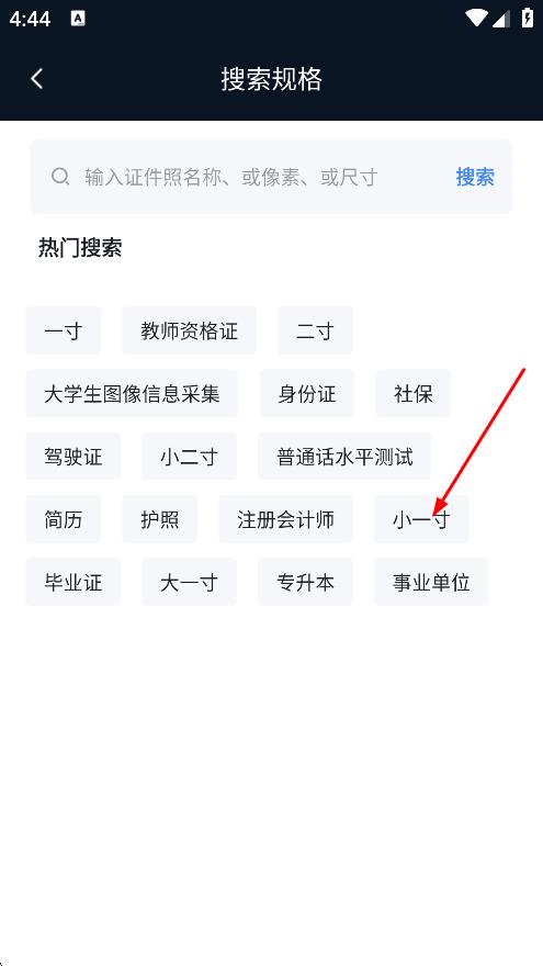 2、在搜索规格页面,点击小一寸,查看相关证件照规格。