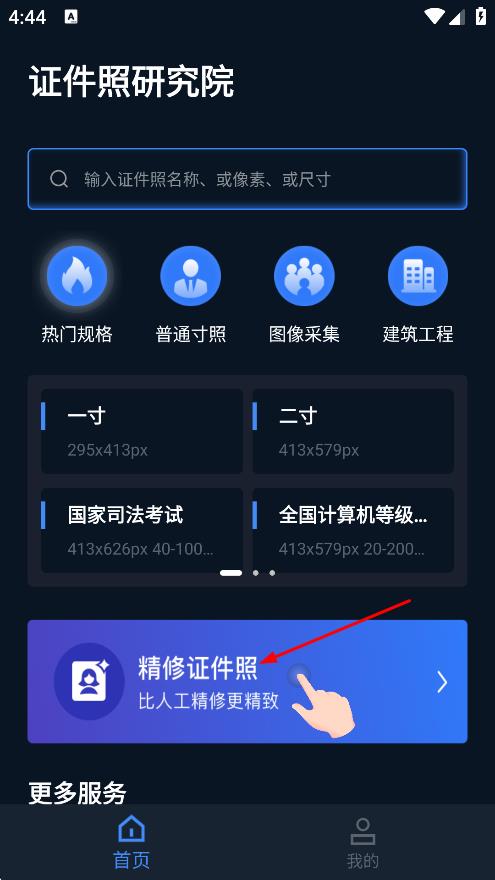 1、在首页,点击精修证件照,进入搜索规格页面。