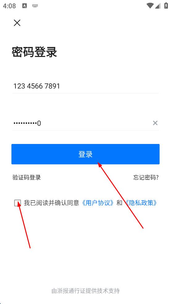 3、在登录界面,选择密码登录方式,输入手机号,接着输入密码,然后勾选“我已阅读并确认同意用户协议和隐私政策。