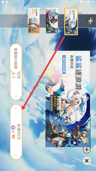 2、选择目标卡池如角色活动祈愿,可以通过点击祈愿10次按钮,触发模拟抽卡流程。