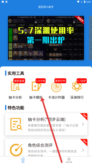 1、在提瓦特小助手首页实用工具区,按照箭头指向处点击抽卡模拟图标,进入抽卡模拟界面。