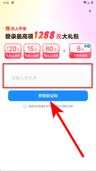 3、输入手机号,勾选后,点击获取验证码。