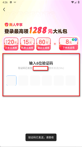 4、在验证码输入页面,填写收到的6位验证码完成注册登录。
