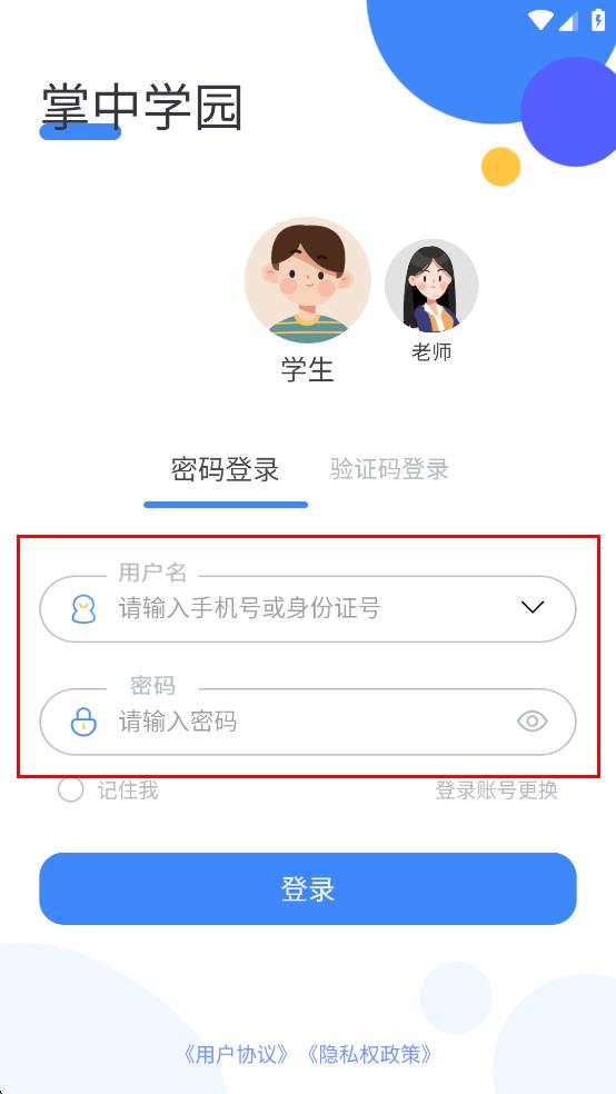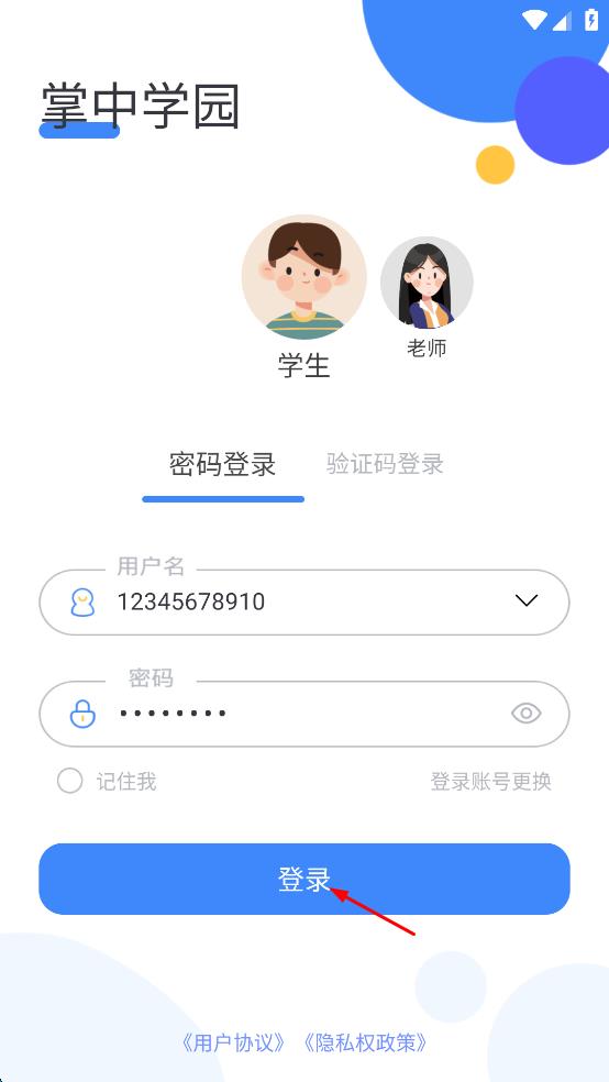 2、进入掌中学园APP登录界面,选择学生身份,点击密码登录选项。