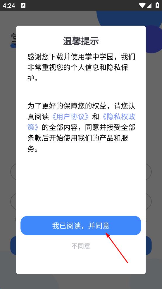 1、打开掌中学园APP,在弹出的温馨提示页面,认真阅读相关内容后,点击我已阅读,并同意按钮。