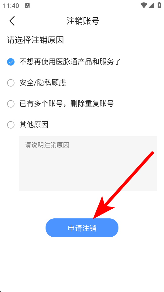 4、在原因选择页面,选择原因后点击申请注销,完成账号注销操作。