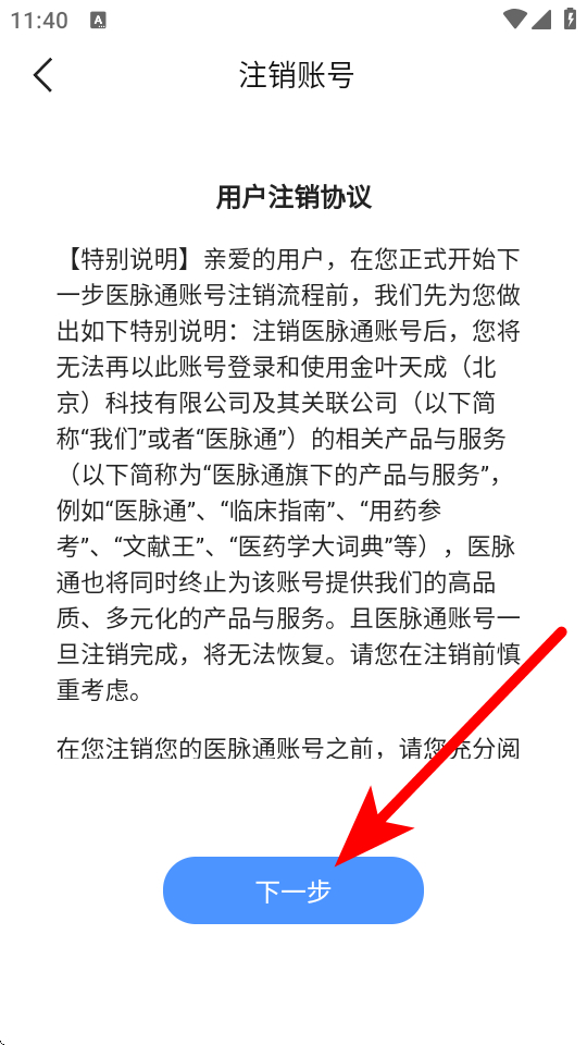 3、在说明页面,阅读协议后点击下一步,进入注销原因选择页面。