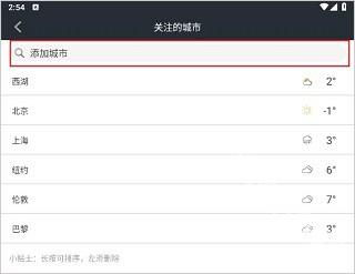 2、在列表中找到“关注的城市”,然后在搜索栏中添加城市,如北京。