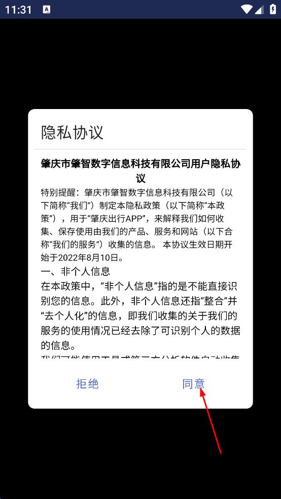 1、打开肇庆出行应用,在隐私协议弹窗中,点击同意按钮,进入主界面。