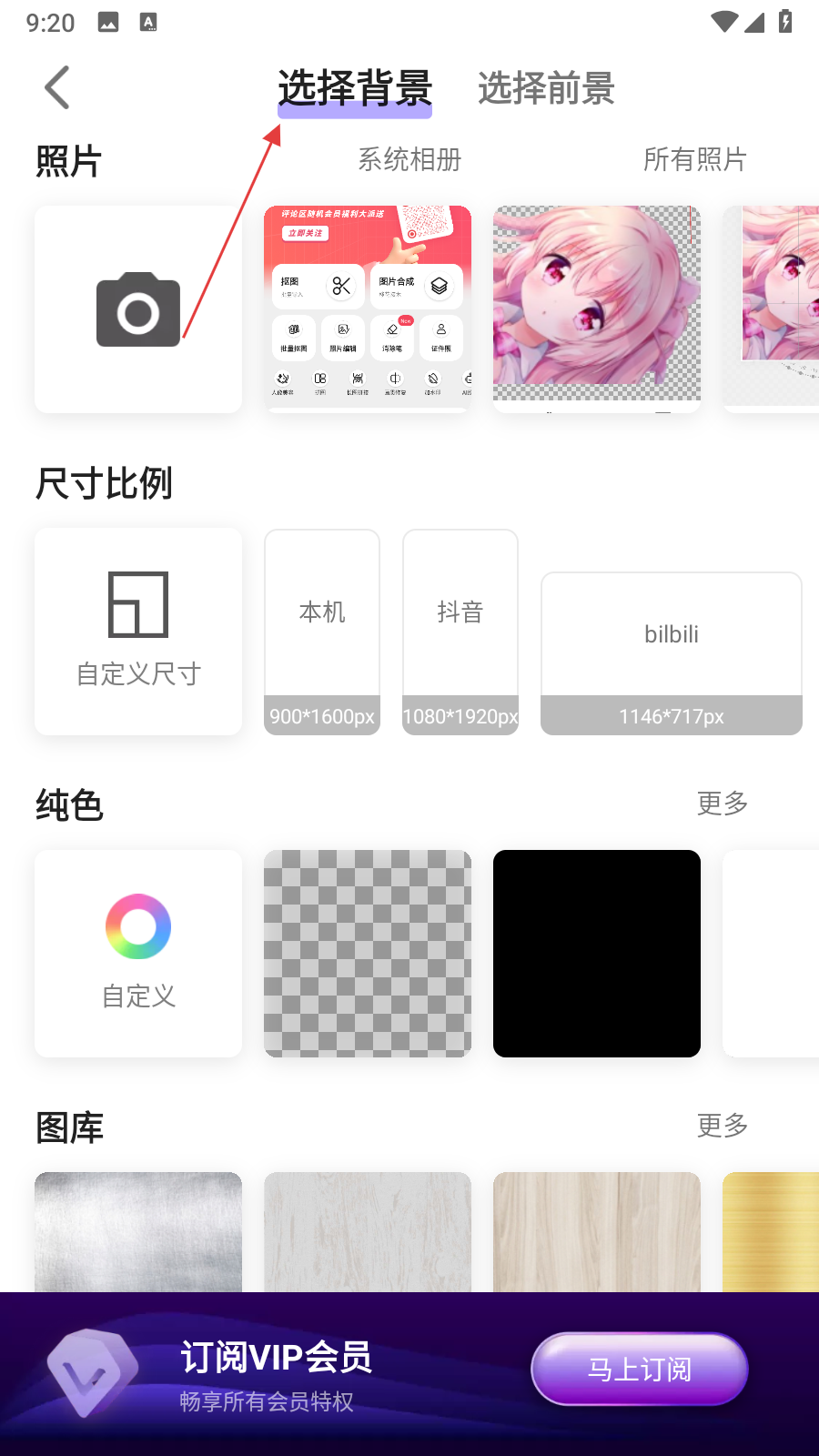 2、进入选择背景页面,选取背景图,或选择纯色背景,也可从图库中选取预设背景。
