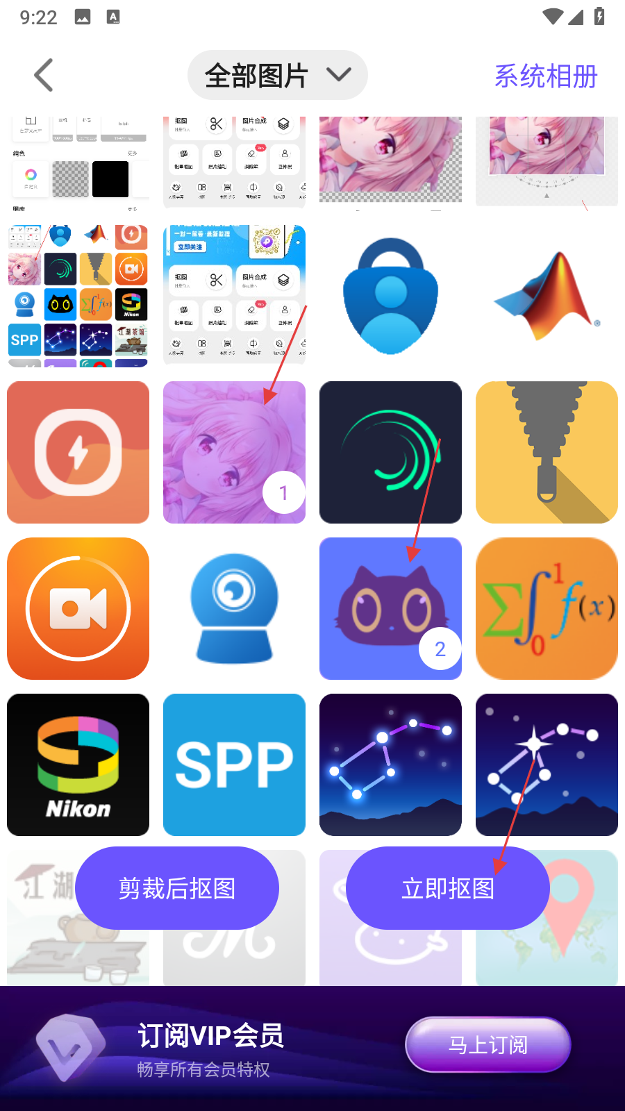 2、在全部图片或系统相册中,点击选择多张需要批量抠图的图片,选择完成后,点击底部立即抠图按钮。