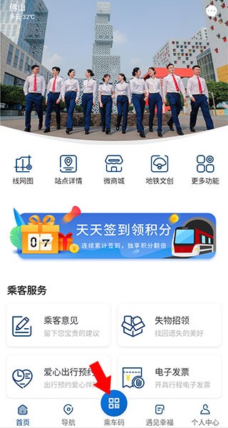 1、下载并打开佛山地铁app,点击下方中间的乘车码按钮。