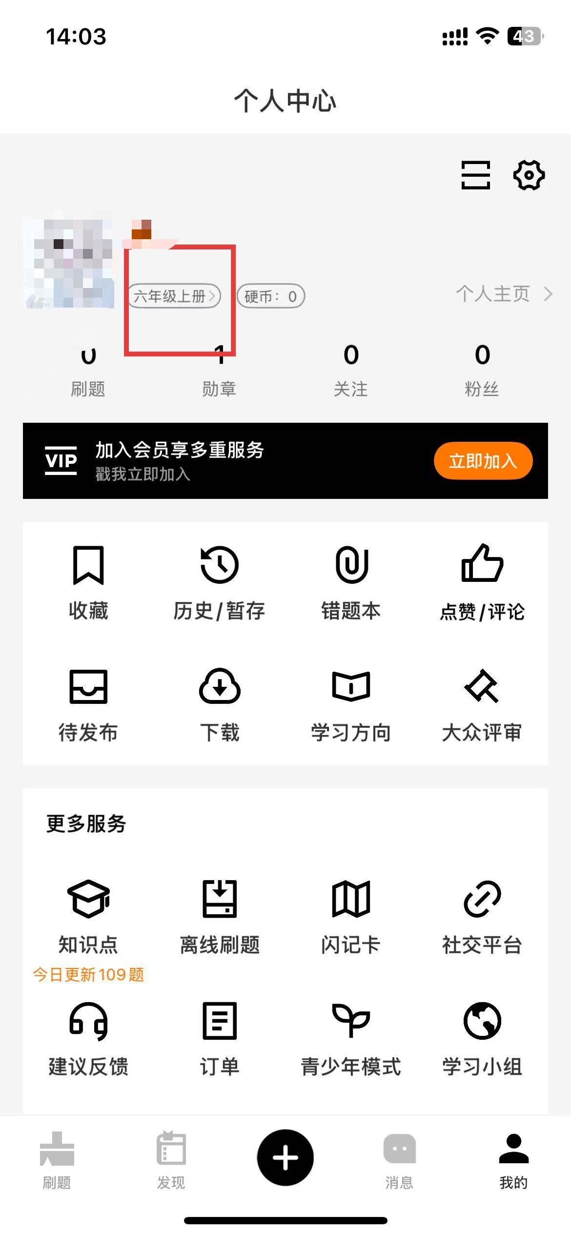 2、在个人中心页面里,找到头像下方显示当前年级的位置,点击该位置 。