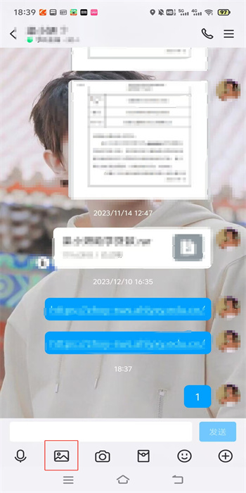2、然后在与你想要发送闪照的联系人界面中,继续点击下方这个方框中的照片图标,进入到自己手机的照片库中进行照片的选择;