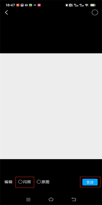 4、在这个照片中的下方就会有一个【闪照】的选项,点击其前面的圆点图标将其选中之后,继续点击【发送】按键就可以向对方发送出自己的闪照了;