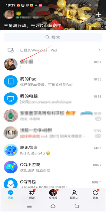 1、首先当你进入到QQ会看待这样的一个首页界面,在这点击你想要发送闪照的联系人,进入到与之的聊天界面中;