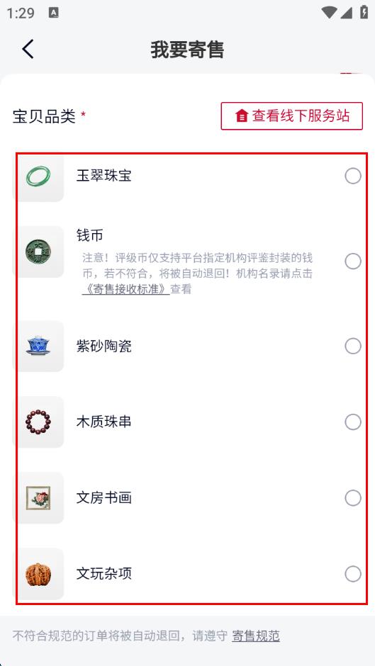 3、进入我要寄售页面后,选择要寄售宝贝的品类。