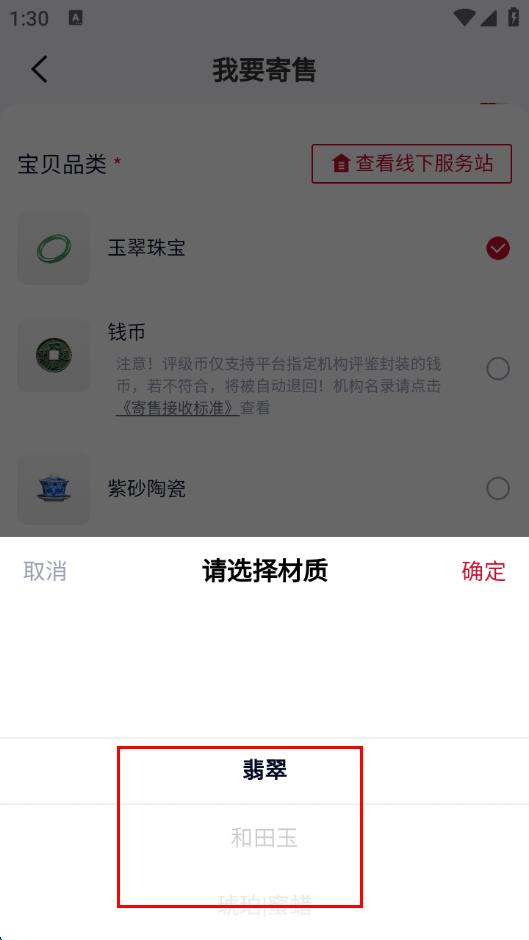 4、若选择了有细分材质的品类,需要进一步选择宝贝的材质,选好后点击确定。