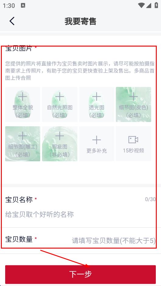 5、按要求上传宝贝图片,填写宝贝名称和数量,点击下一步,完成后续操作。