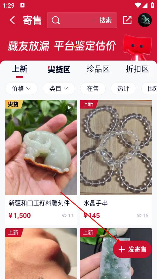 2、在寄售页面中,点击右下角+发寄售按钮。