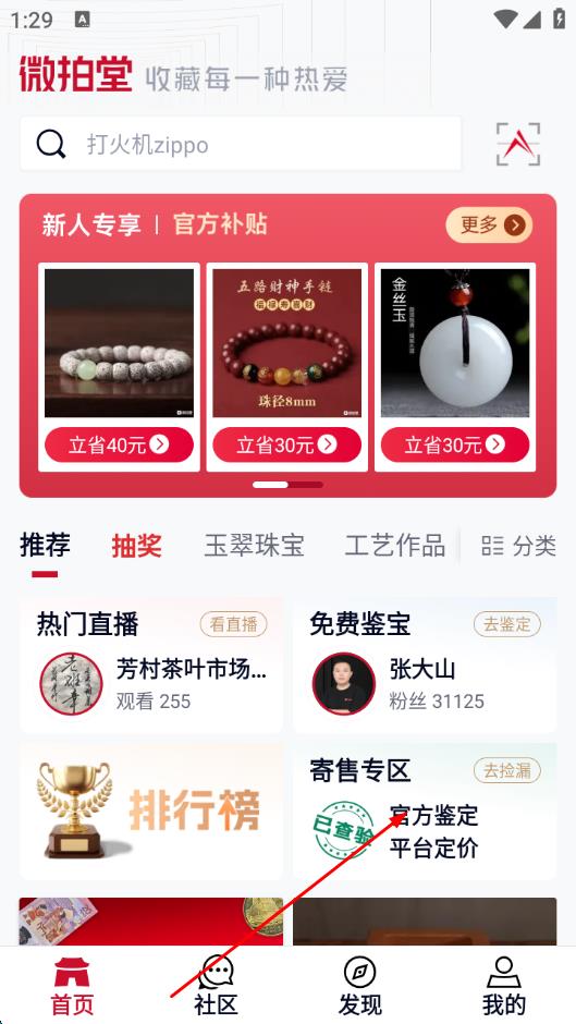 1、打开微拍堂APP,进入首页,点击寄售专区进入寄售页面。