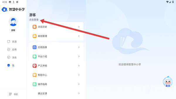 1、在智慧中小学平台首页,点击左侧导航栏的我,进入个人中心界面,查看游客状态下的功能选项。