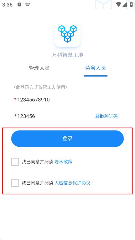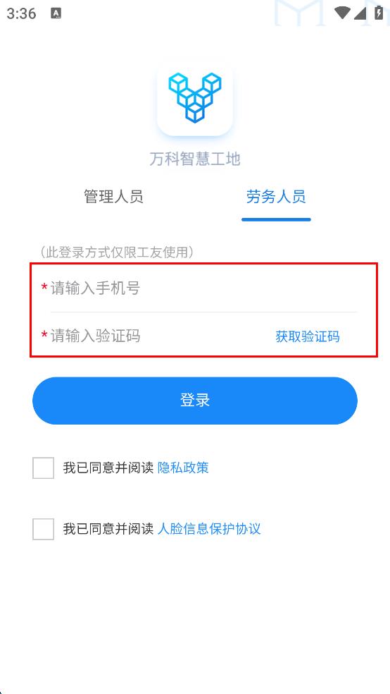 3、在劳务人员登录界面,输入手机号码,点击获取验证码并输入。