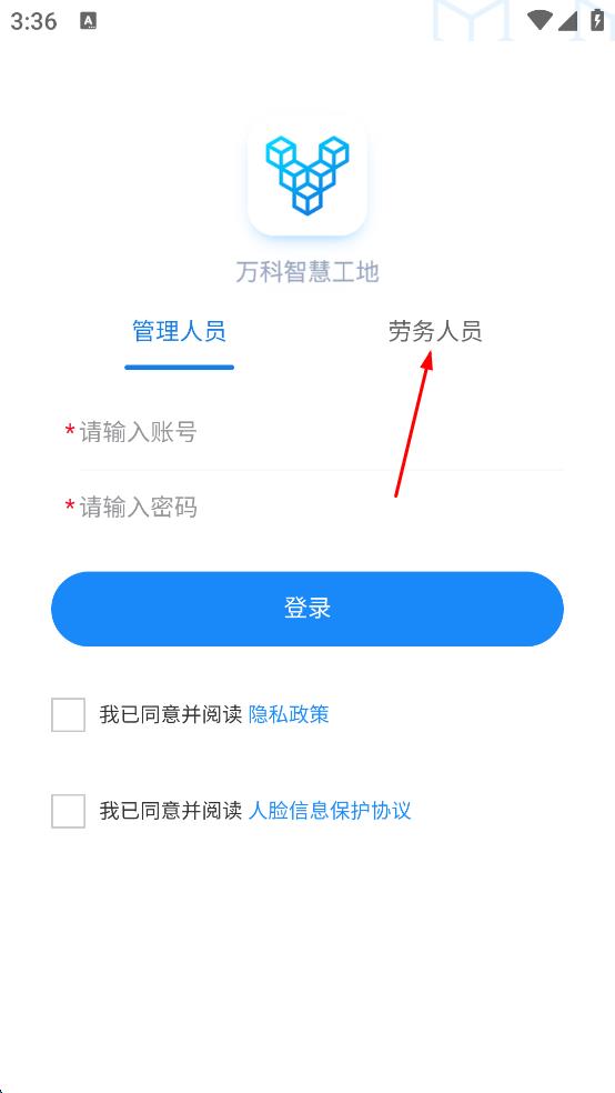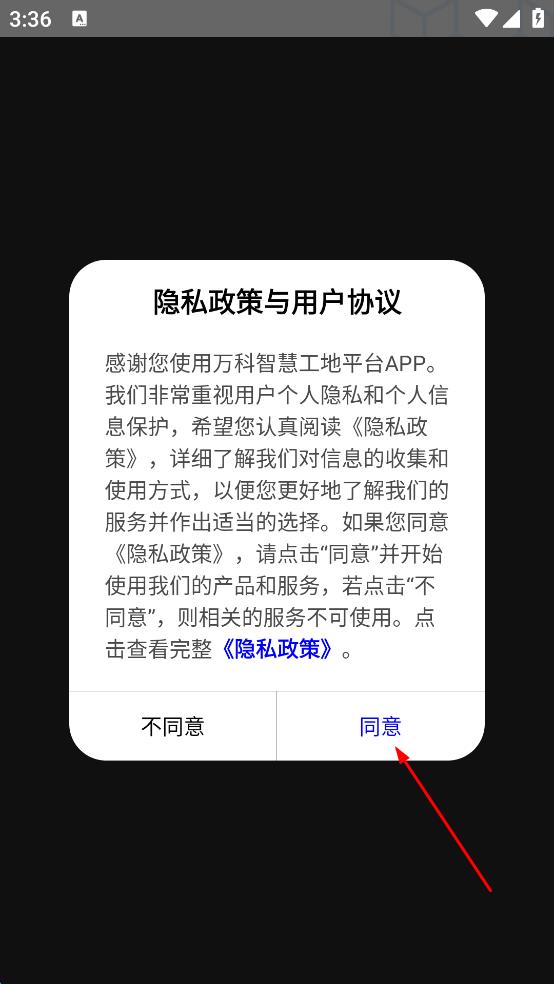 1、打开万科智慧工地平台APP,出现隐私政策与用户协议提示框,点击同意。