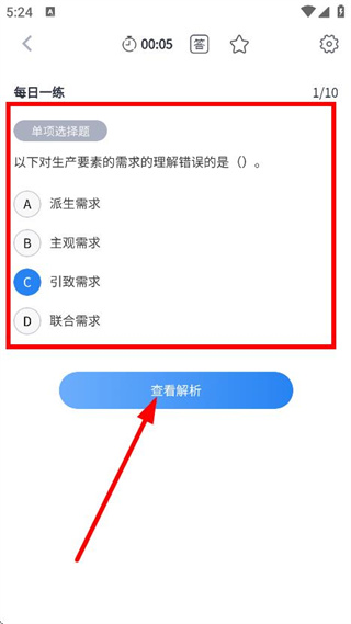 3、在每日一练题目页面,作答题目后,点击查看解析,查看题目解析。