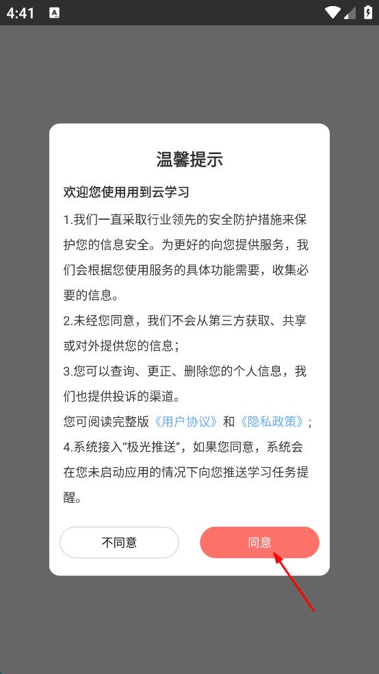 1、打开用到云学习,出现温馨提示框,点击同意。