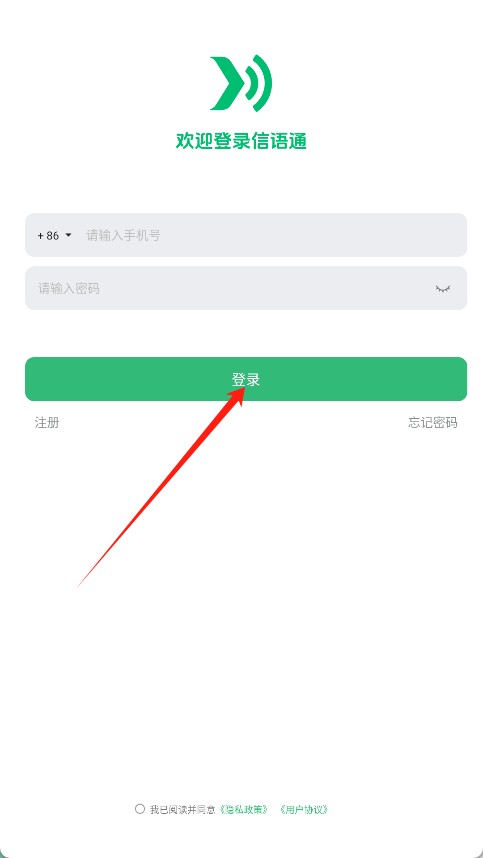 1、在登录界面输入手机号与密码,勾选同意协议后点击“登录”按钮。