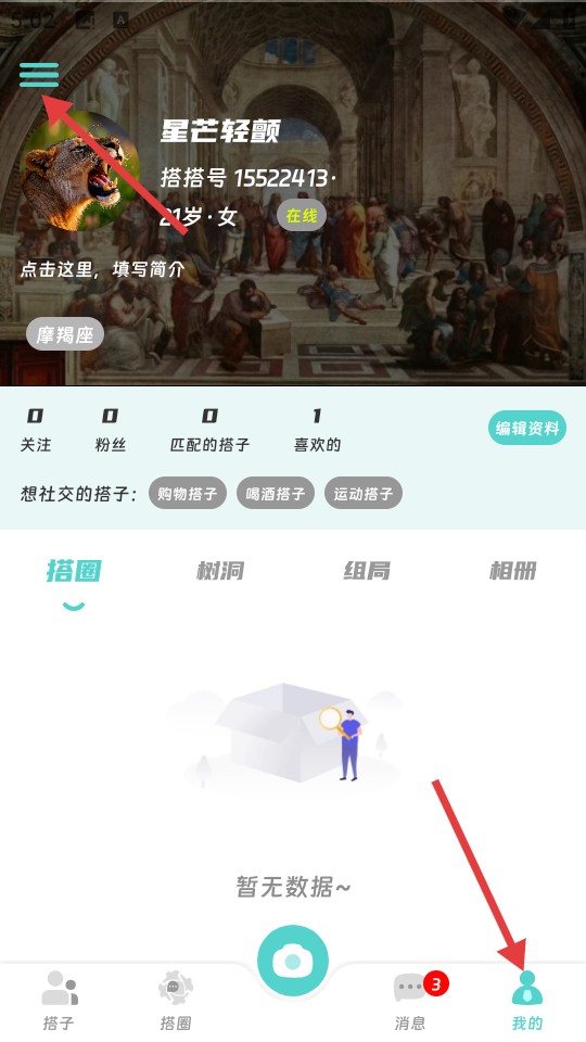 1、进入APP,进入【我的】页面,再点击左上角菜单按钮。