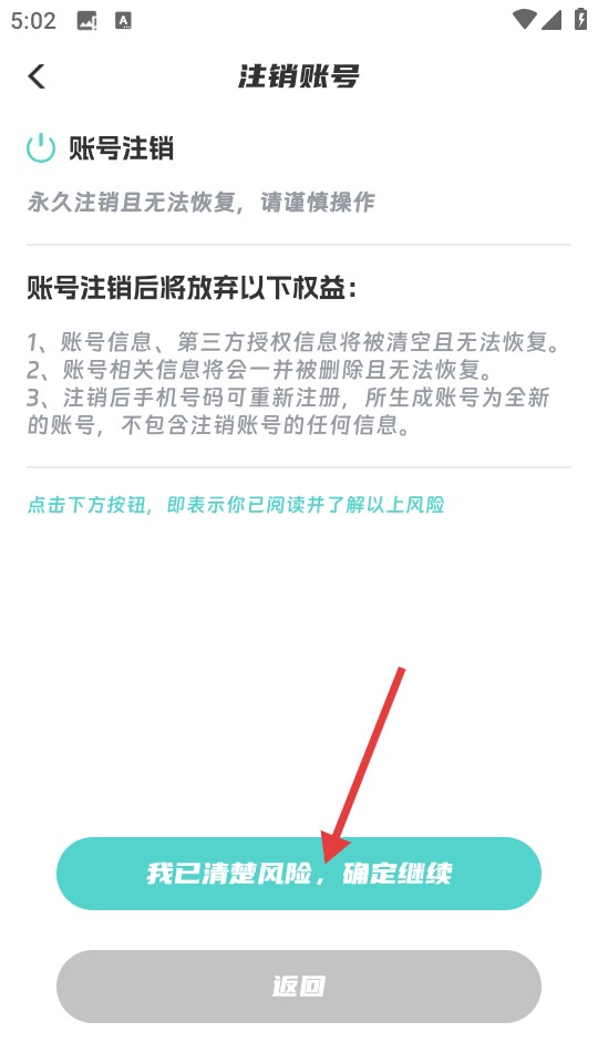 4、在注销账号页面,仔细阅读账号注销的风险提示,若确认要注销,点击【我已清楚风险,确定继续】。
