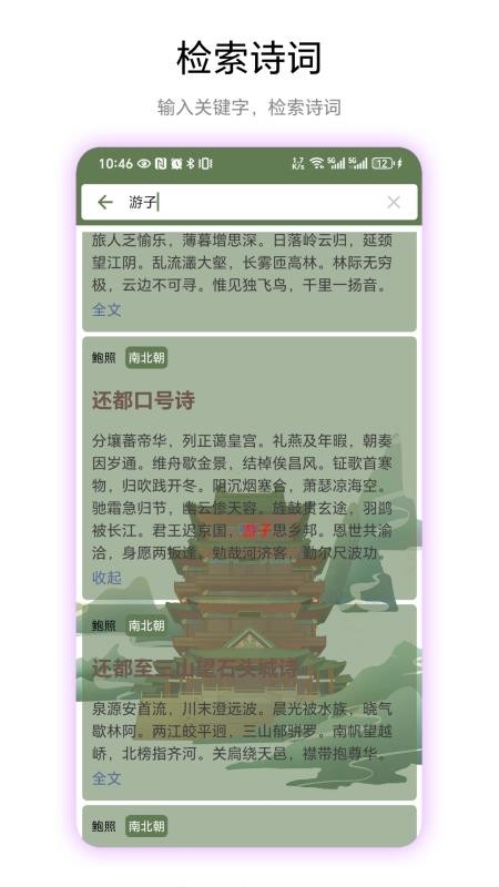 通过主动搜索即可查找指定的一篇古诗词内容,获取想要的古诗词阅读欣赏;