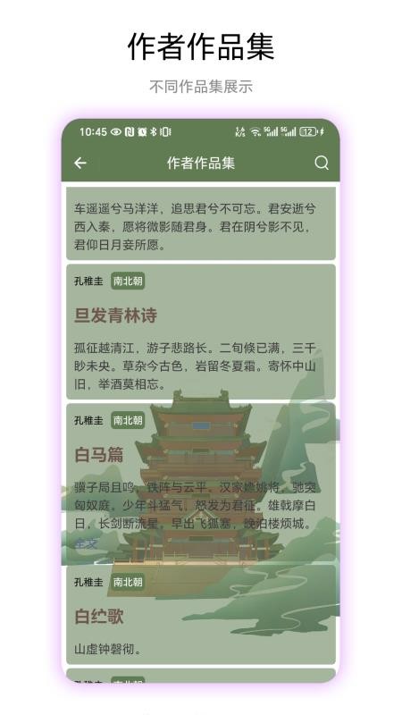 用户通过各大作品合集可以找到想要的古诗词,拥有不同作者的个人诗词合集;