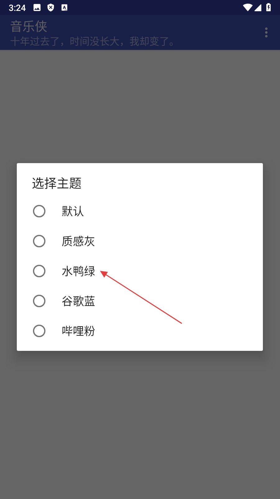 3、在主题选择弹窗里,选择【水鸭绿】,进行界面主题的更换。