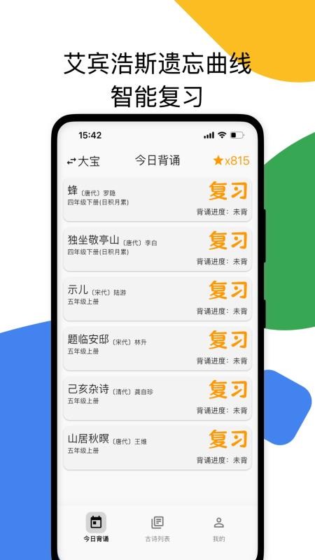 清晰明了的古诗学习计划,让未来多天的学习任务一目了然,一手掌握学习进度;